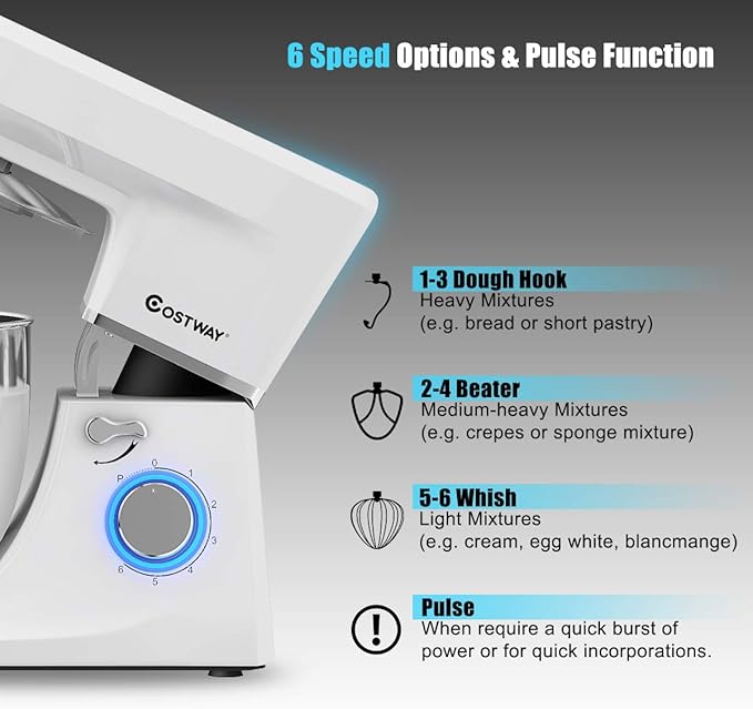 COSTWAY Stand Mixer, 6-Speed 7.5 QT Tilt-head Electric Kitchen Food Mixer 660W with Stainless Steel Bowl, Dough Hook, Beater, Whisk