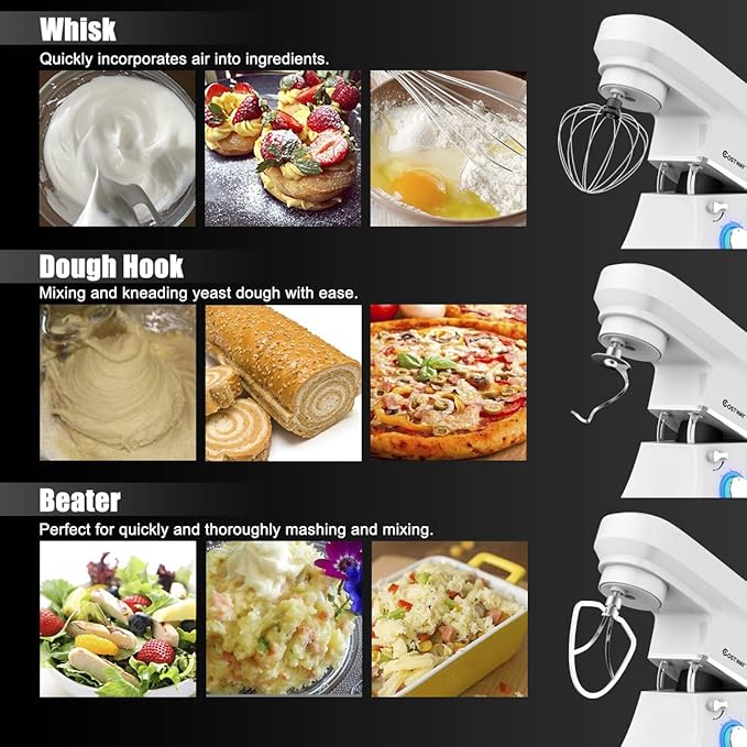 - 3 DIFFERENT ATTACHMENTS FOR VERSATILE USAGE------Featured with 3 different attachments( dough hook, beater, whisk), it is perfectly designed for you to do all types of food mixing, including creaming, mixing, beating, whipping, kneading. You can now make a wealth of new recipes, from cakes, cookies, to breads.
