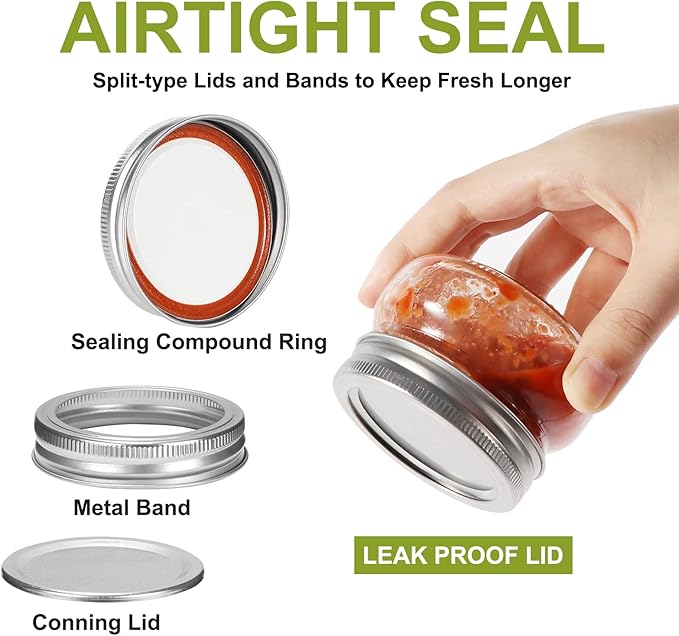 - Package include: 24 Pack 4oz/120ml mason jars with silver split-type screw metal lids; Size: 3.1inch(Base Width) x 2.1 inch(Height) x 2.75 inch(Regular mouth)