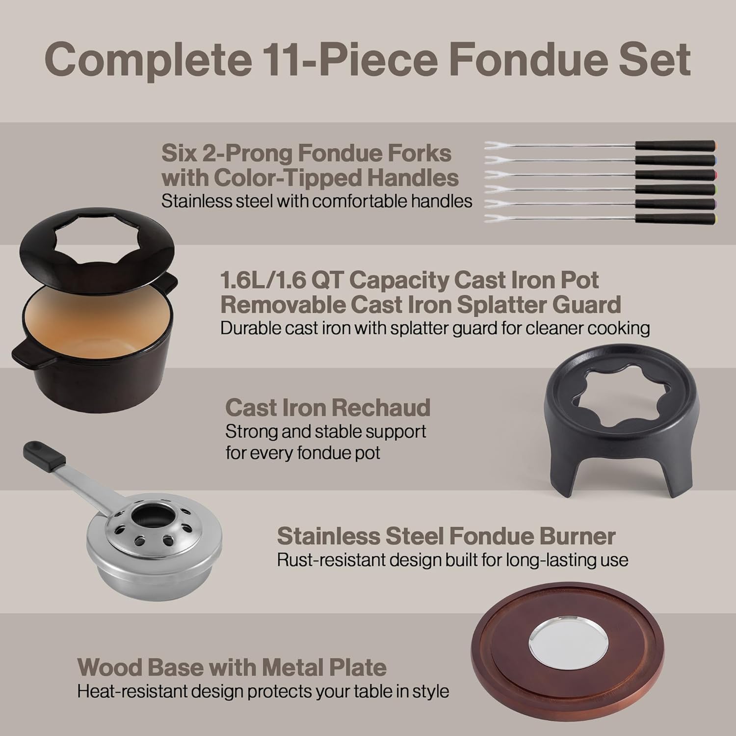 - Compatible and Easy to Clean: Can be used on all heat sources and is easy to clean, making it ideal for melting cheese, chocolate, and more. This versatile cast iron fondue set measures 8-1/4 inches ( 20.96 cm) high by 8 inches (20.32 cm) in diameter, with the pot measuring 6-3/4 inches (17.15 cm).