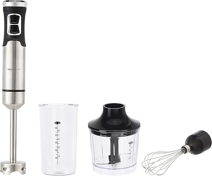 Amazon Basics Multi-Speed Immersion Hand Blender for Kitchen Mixing, Smoothies, Soups, 500 Watt Powerful, with Blending Stick, Whisk, Chopper and Beaker, Silver