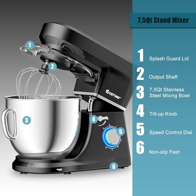 COSTWAY Stand Mixer, 6-Speed 7.5 QT Tilt-head Electric Kitchen Food Mixer 660W with Stainless Steel Bowl, Dough Hook, Beater, Whisk