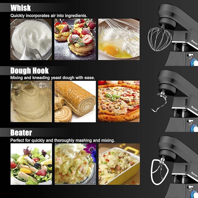 - 3 DIFFERENT ATTACHMENTS FOR VERSATILE USAGE------Featured with 3 different attachments( dough hook, beater, whisk), it is perfectly designed for you to do all types of food mixing, including creaming, mixing, beating, whipping, kneading. You can now make a wealth of new recipes, from cakes, cookies, to breads.