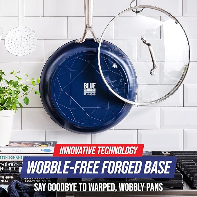 Blue Diamond 12" Nonstick Frying Pan with Lid, Diamond Infused PFAS & PTFE-Free Ceramic Skillet, Dishwasher & Oven Safe, Stay Cool Handle, Durable Non Toxic Metal Utensil Safe, Glass Lid, Blue