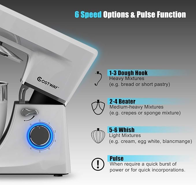 - TILT-HEAD & ANTI-SLIP DESIGN------The tilt-head design mixer allows access to install or uninstall bowl and its attachments easily by an easy-to-control knob, which also convenient for you to add ingredients for a recipe. Anti-slip suction cups are specially designed to keep mixer balanced and steady while working.
