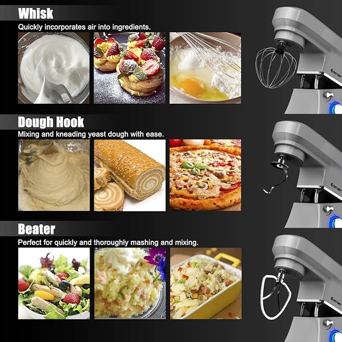 - 3 DIFFERENT ATTACHMENTS FOR VERSATILE USAGE------Featured with 3 different attachments( dough hook, beater, whisk), it is perfectly designed for you to do all types of food mixing, including creaming, mixing, beating, whipping, kneading. You can now make a wealth of new recipes, from cakes, cookies, to breads.