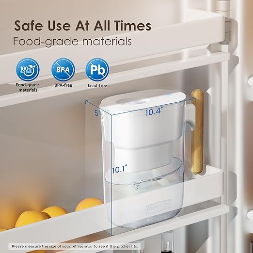 - Natural wood, Fashion choice: The natural wood handle of the water filter pitcher with lid meets the ergonomics design. The Waterdrop filtered water pitcher can be put on one side door of most refrigerator. Product Dimensions: 10.4"*5"*10.1". Please measure your fridge to ensure it fits.
