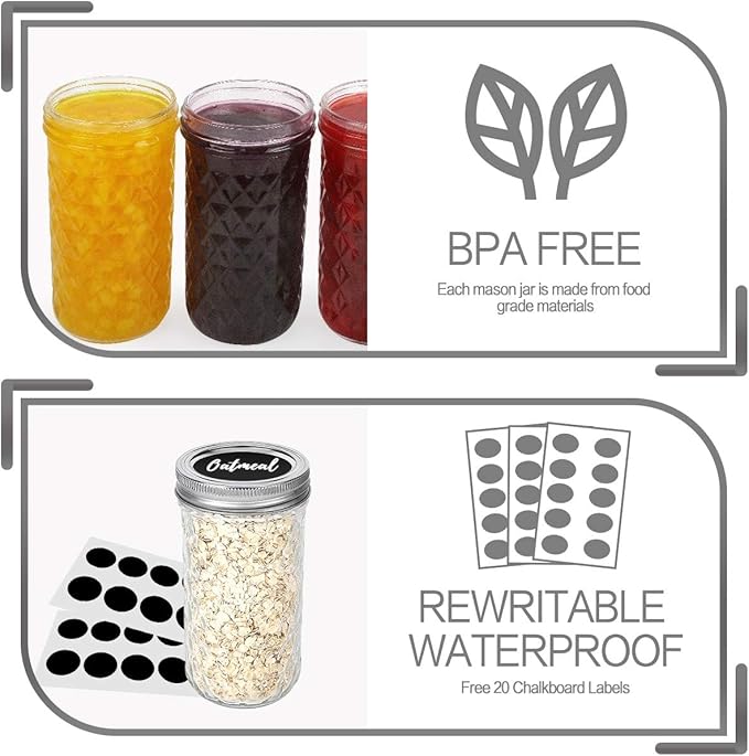 - Excellence in Quality:Thick 12oz VERONES glass jars with food-safe, corrosion resistant lids - material meets certified safety standards.Each jar comes with a time tested airtight ceiling compound to help ensure a quality seal with each lid, making them suitable for use in preserving and canning. Safe for the refrigerator and the freezer