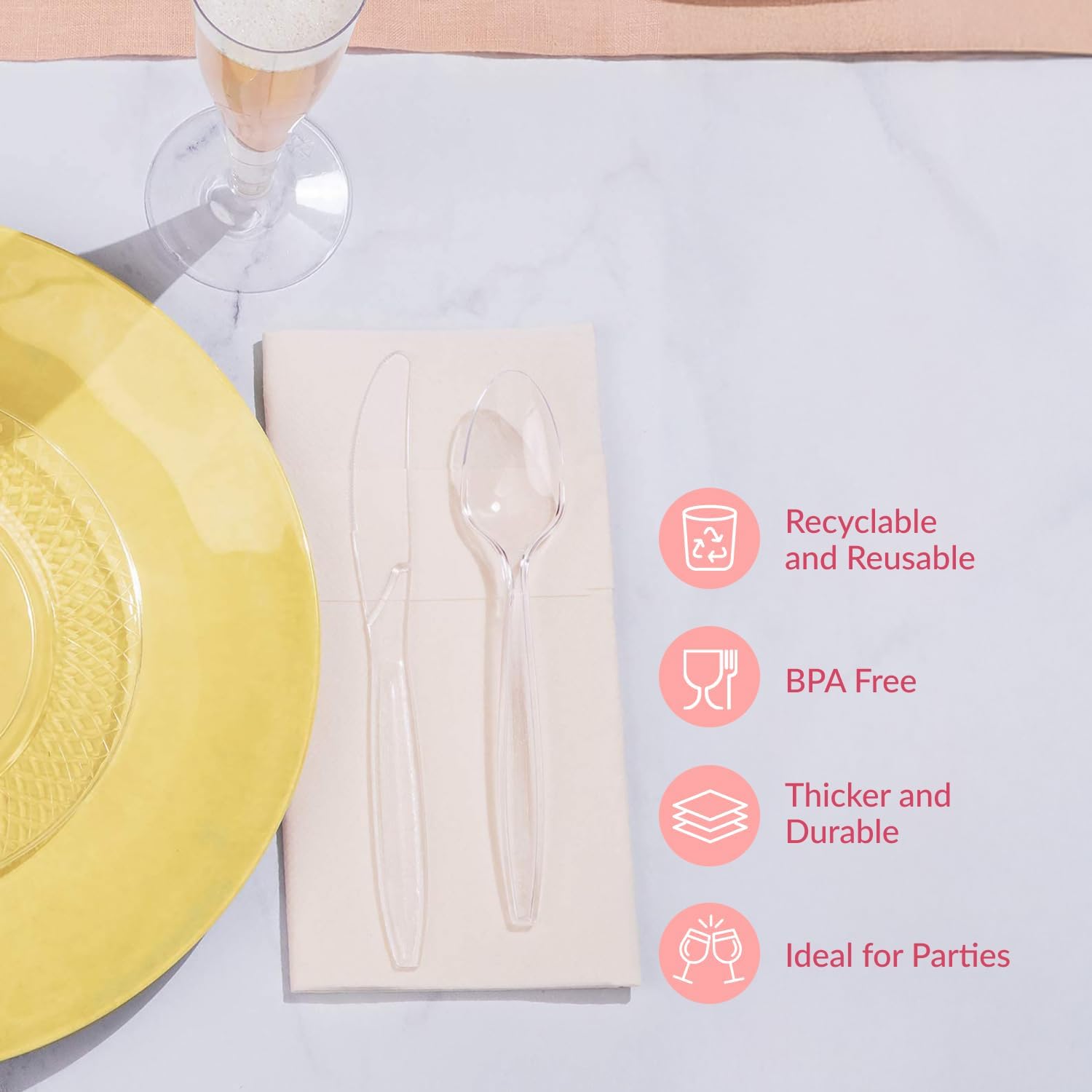 - Bulk 100 Pack of Disposable Spoons: This large pack of durable plastic cutlery ensures you always have enough clear spoons for restaurants, holiday celebrations, buffets, and corporate luncheons
