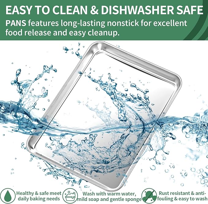 - Easy Clean & Nonstick: Nonstick stainless steel baking pans tray keep food contained and prevent food juice flowing everywhere, Keeping your oven neat. Dishwasher can save your time and labor after using.Easy to clean up even in hand-wash. Stainless steel cookies pan features long-lasting nonstick for excellent food release and easy cleanup
