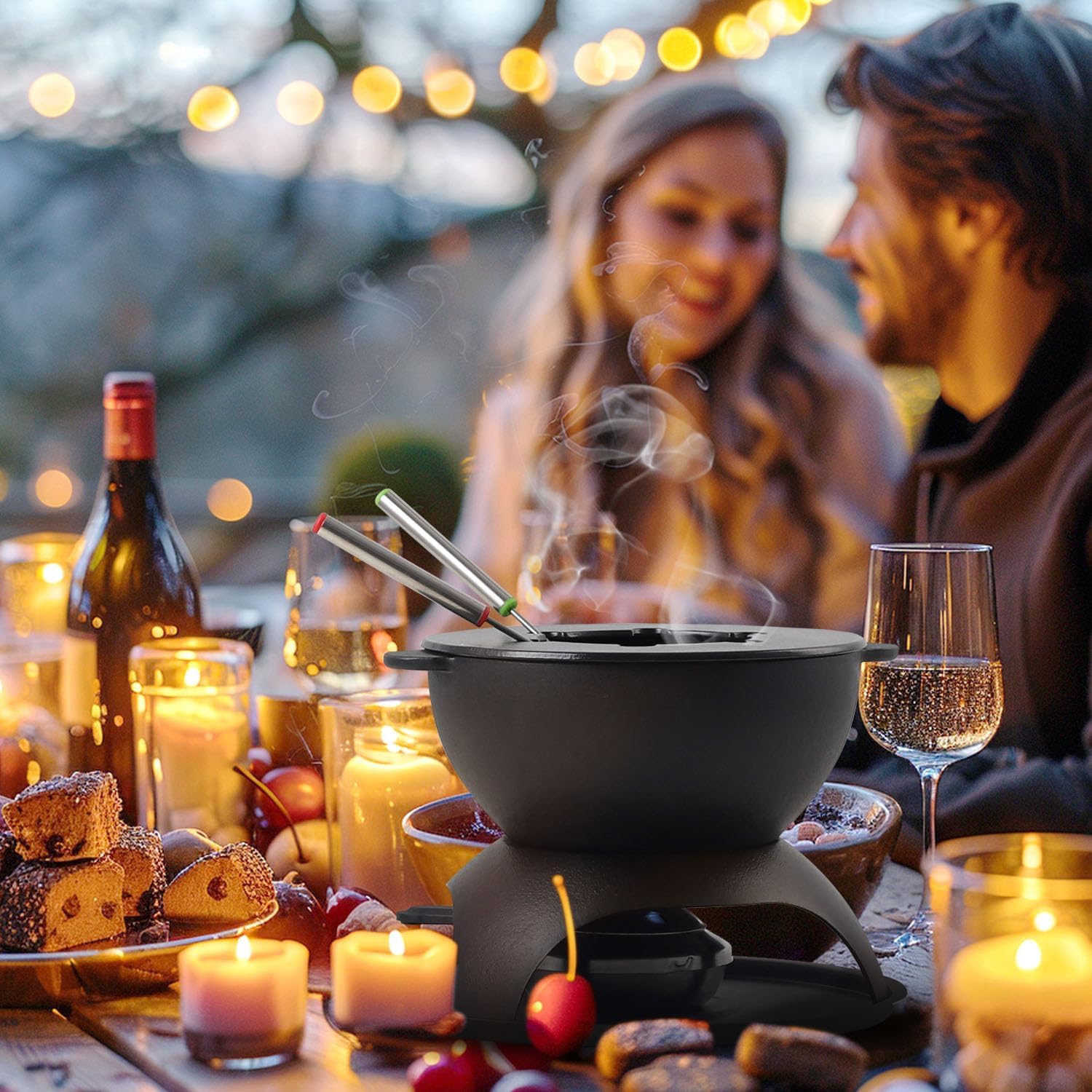 - VERSATILE CAST IRON FONDUE EXPERIENCE: Enjoy a delightful array of cheese and chocolate fondue recipes with our compact 1.26-quart cast iron fondue pot (Dimensions: 8.66" L x 7.28" W x 3.54" H). Perfect for up to 6 people, it's ideal for birthdays, daily use, family gatherings, camping trips, picnics, or any special occasion to share memorable moments with friends and family