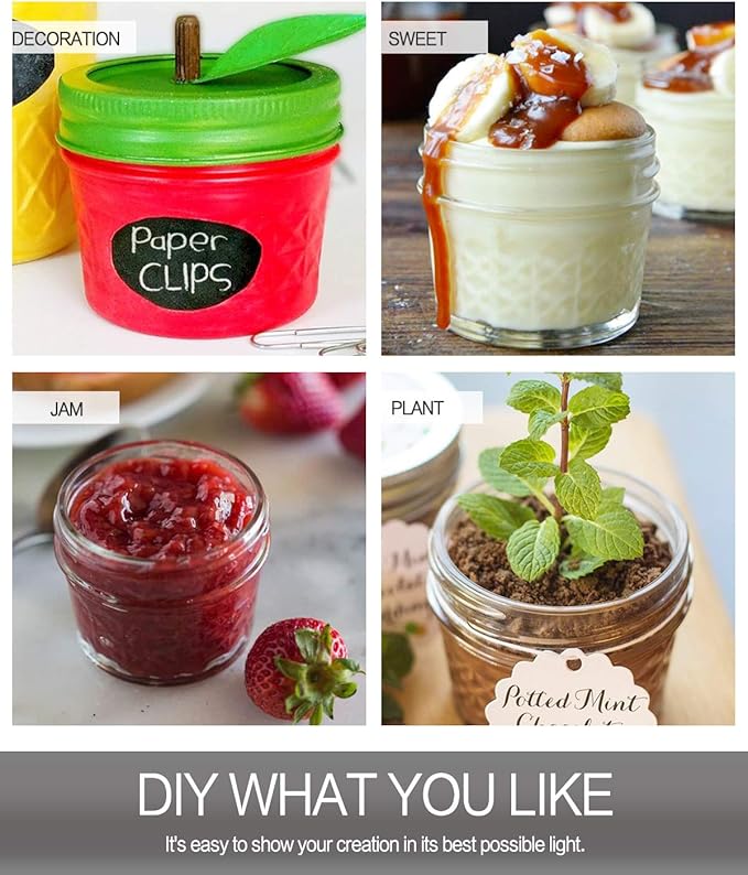 - FOOD GRADE:Each mason jar is made from food grade materials.Great for food storage.Suitable for use in preserving and canning. Safe for the refrigerator and the freezer