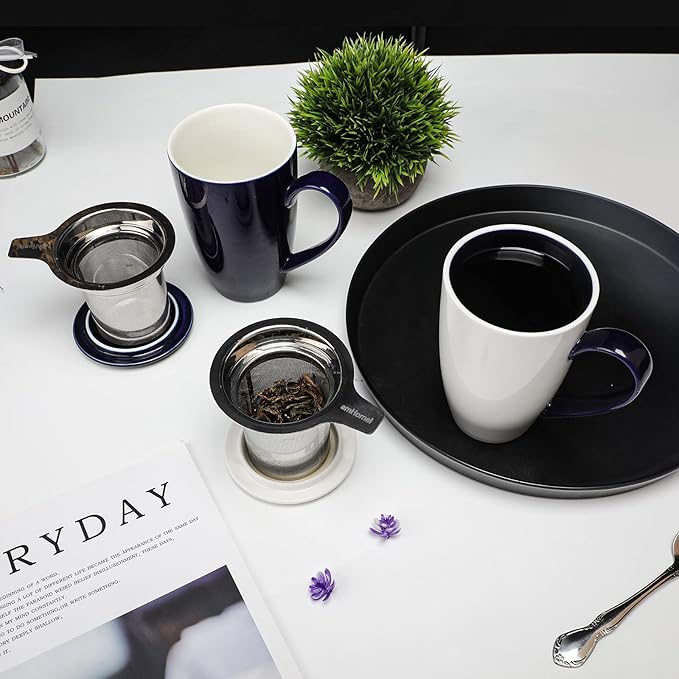 amhomel Porcelain Tea Mug with Infuser and Lid, 16 Ounce Ceramic Tea Cup for Loose Leaf, Coffee, Cocoa and Milk, Tea Gift for Tea Lovers, Set of 2(Navy Blue and White)