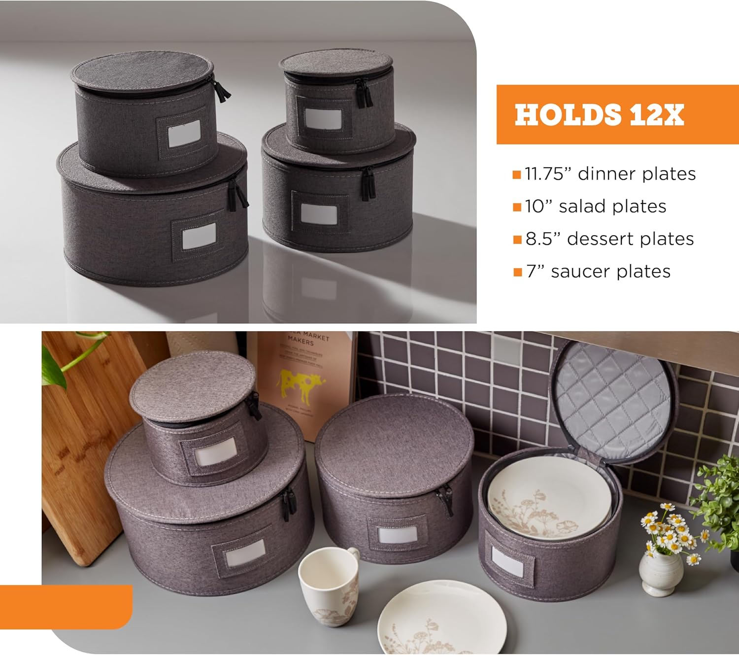 - COMPLETE SET. Includes an 11¾'' dinner plate case, 10'' salad plate case, 8½'' dessert plate case, and 7'' saucer plate case. Each plate organizer holds 12 plates with matching felt plate dividers.