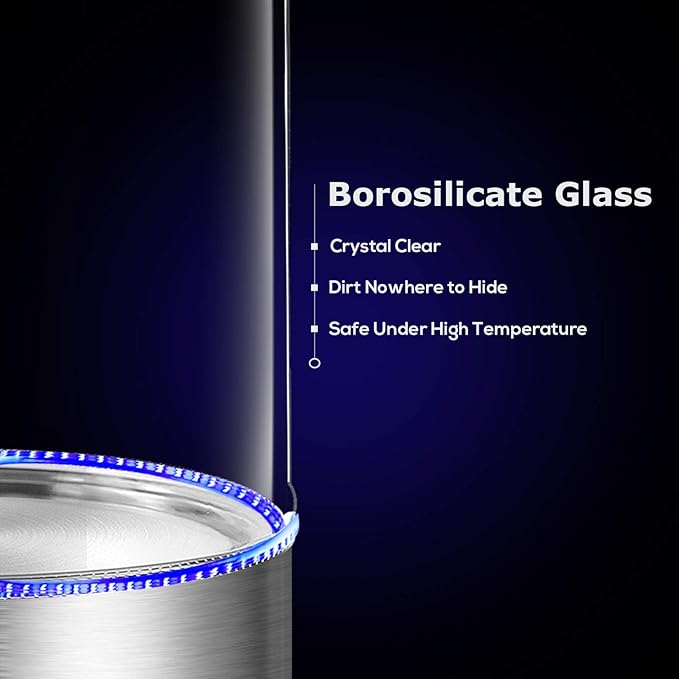 - 【High quality & Healthier】The electric kettle combination of food-grade glass and 304 stainless steel makes it not only looks cool but also healthier to boil water. The borosilicate glass has a very low coefficient of thermal expansion, making it resistant to thermal shock. And 100% stainless steel inner lid and bottom, BPA-Free, takes care of your safety and health.