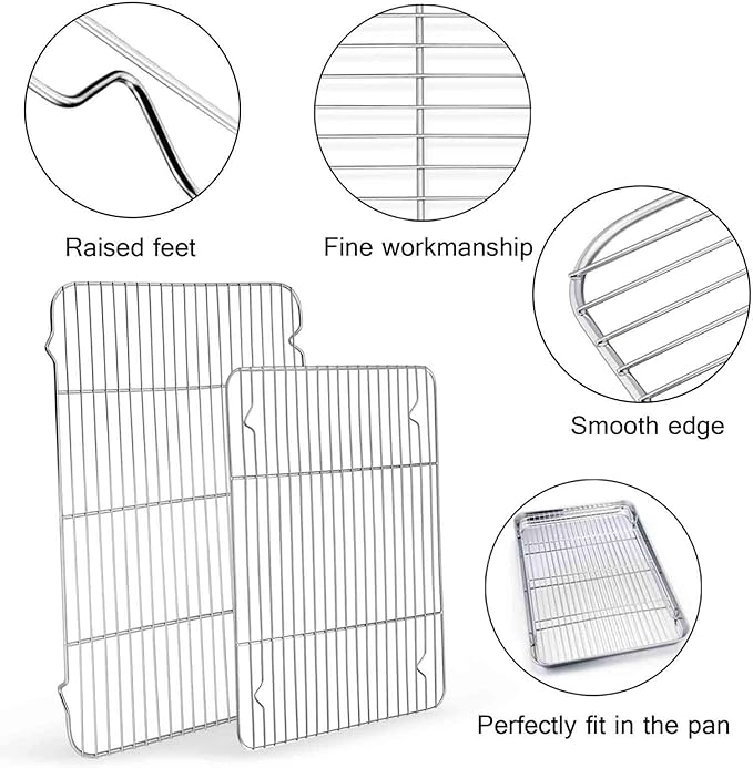 - MULTIFUNCTIONAL: The cookie pans and wire baking racks perfect for baking cookies / chicken / bacon, Roasting steaks /shrimp, Cooling bread / pizza / cupcake, Baking tray even ideal be a serving pan, An economical choice for family baking
