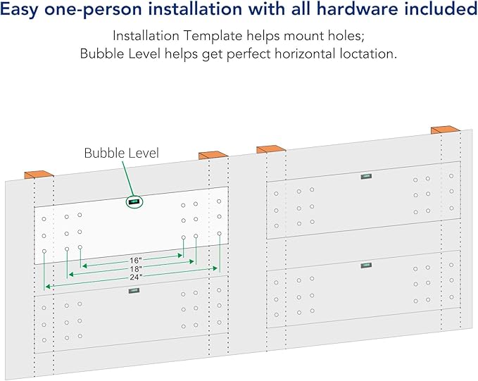 - Easy one-person installation with all hardware included: Installation Template helps mount holes; Bubble Level helps get perfect horizontal location. (Assembly needed DIY project - Composition of four 1'x3' shelves per tier)