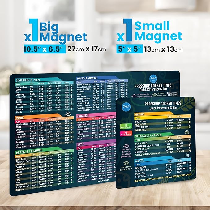 - Just Stick It: The instant pot magnet cheat sheet features a magnetic backing that allows you to easily stick them to your fridge or any other magnetic surface in your kitchen. Larger font is printed on the small magnet with your most used foods for even quicker referencing. They make an excellent gift for all occasions as well!
