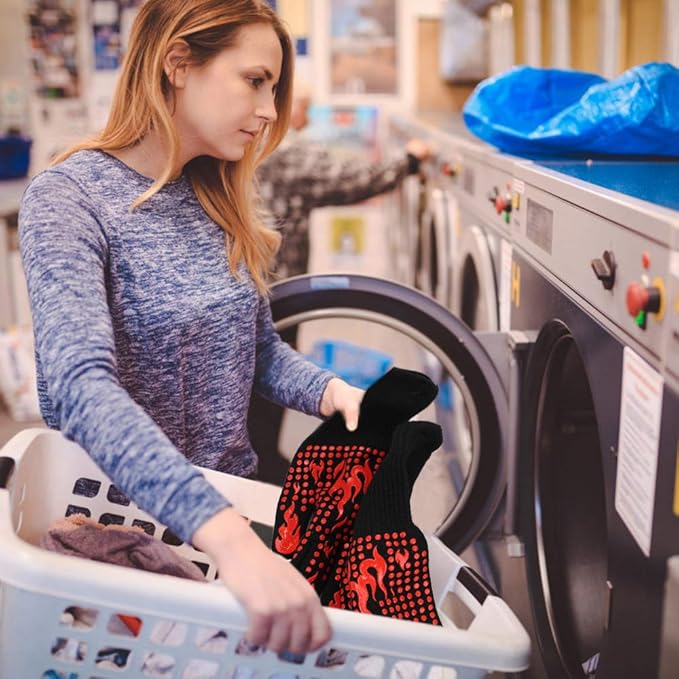 - Easy to clean and store: Our heat resistant gloves can be easily cleaned either by machine washing or hand washing. The inner side of the cuffs features a convenient loop for hanging and drying, making storage a breeze.