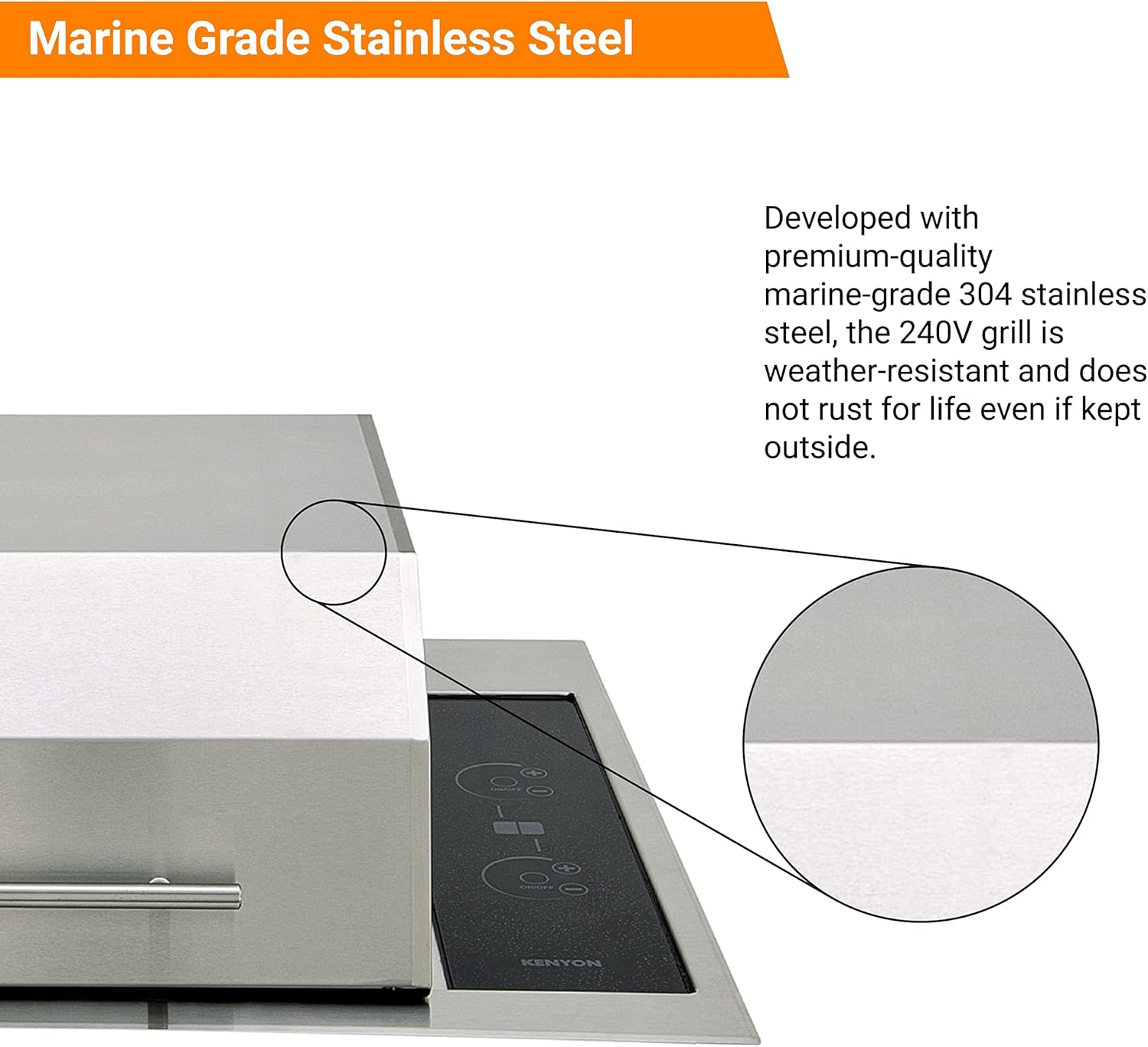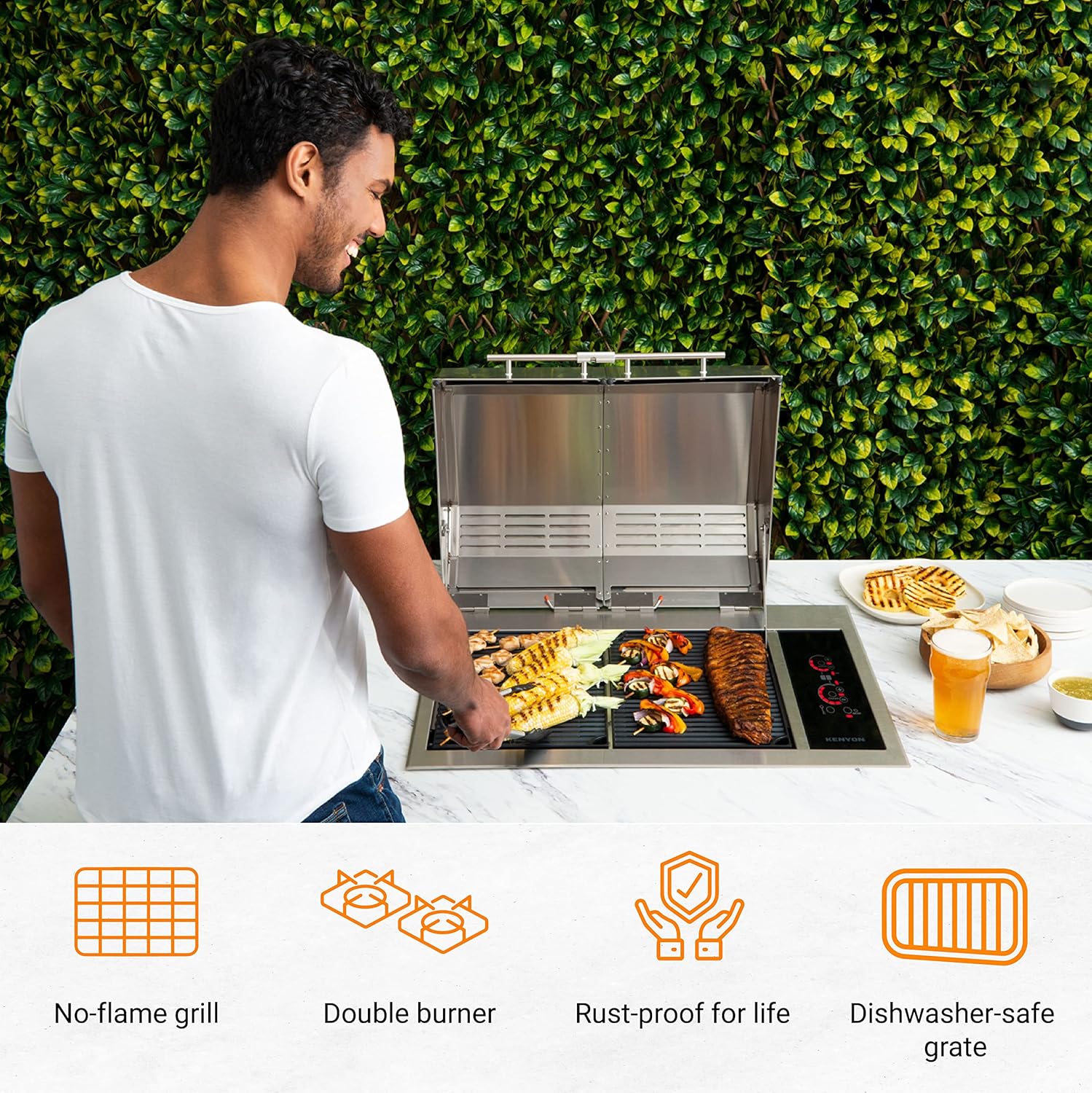 Kenyon Texan Built-In Electric Grill for Stone Counter, Standard Lite-Touch, Stainless Steel Grill with Split Lid for Indoor and Outdoor Use, 2 Burners, Quick Heat Up, Dishwasher Safe Grate, 240V