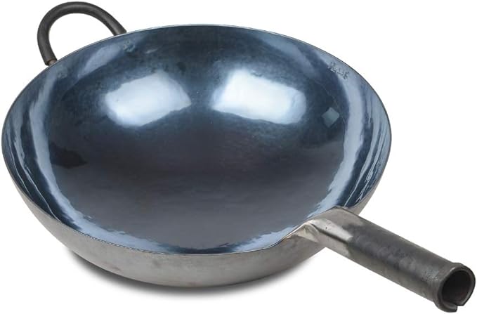 臻三环 ZhenSanHuan Chinese Hand Hammered Iron Woks and Stir Fry Pans, Non-stick, No Coating, Carbon Steel Pow (34CM, BlueBlack Seasoned with help handle)