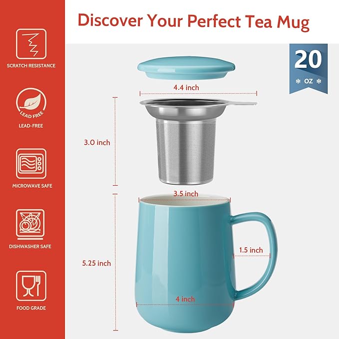 - Ex-Large Tea Infuser: 20 oz Large tea mug with an infuser and lid is your best choice, no matter go outdoors in your living room & backyard. The 20 oz capacity is enough for a day's drinking, and you'll never have to carry another tea maker. More convenient and simple.