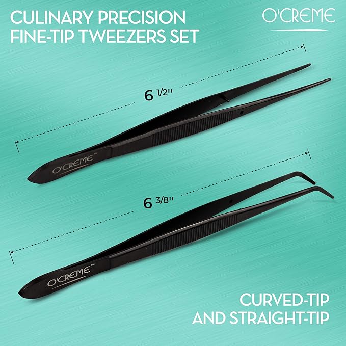 O'Creme Black Stainless Steel Precision Kitchen Culinary Fine-Tip Tweezer Tongs, 1 Curved and 1 Straight