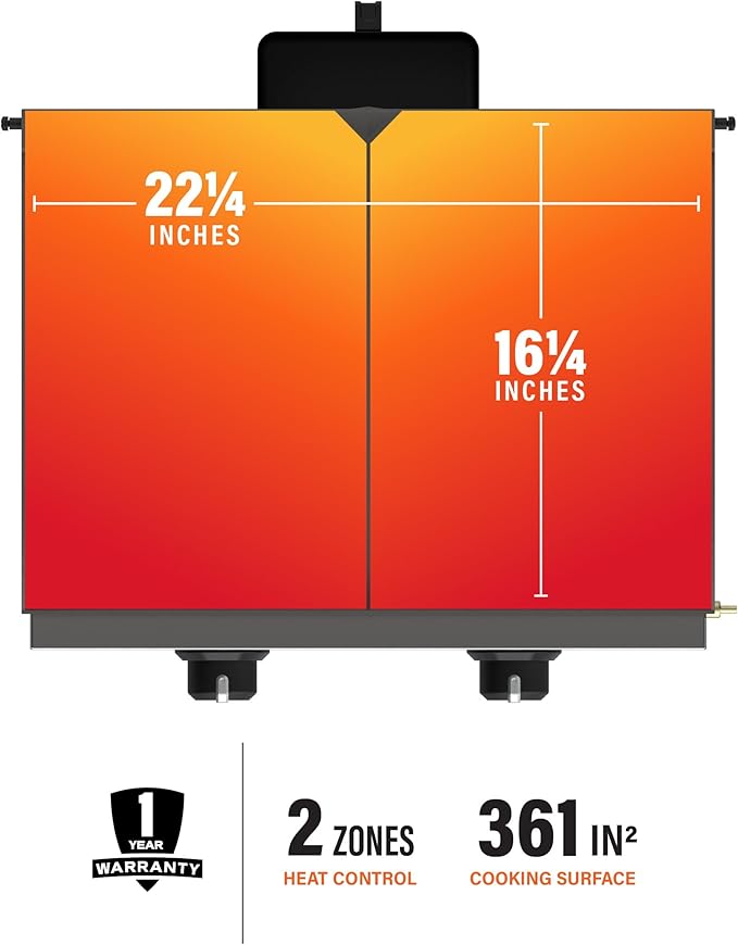 - Surprisingly Spacious Cooking Area: This compact griddle is more spacious than you would think. Cook up to 14 burgers at a time on the 22” griddle top with 361 square inches of cooking space.