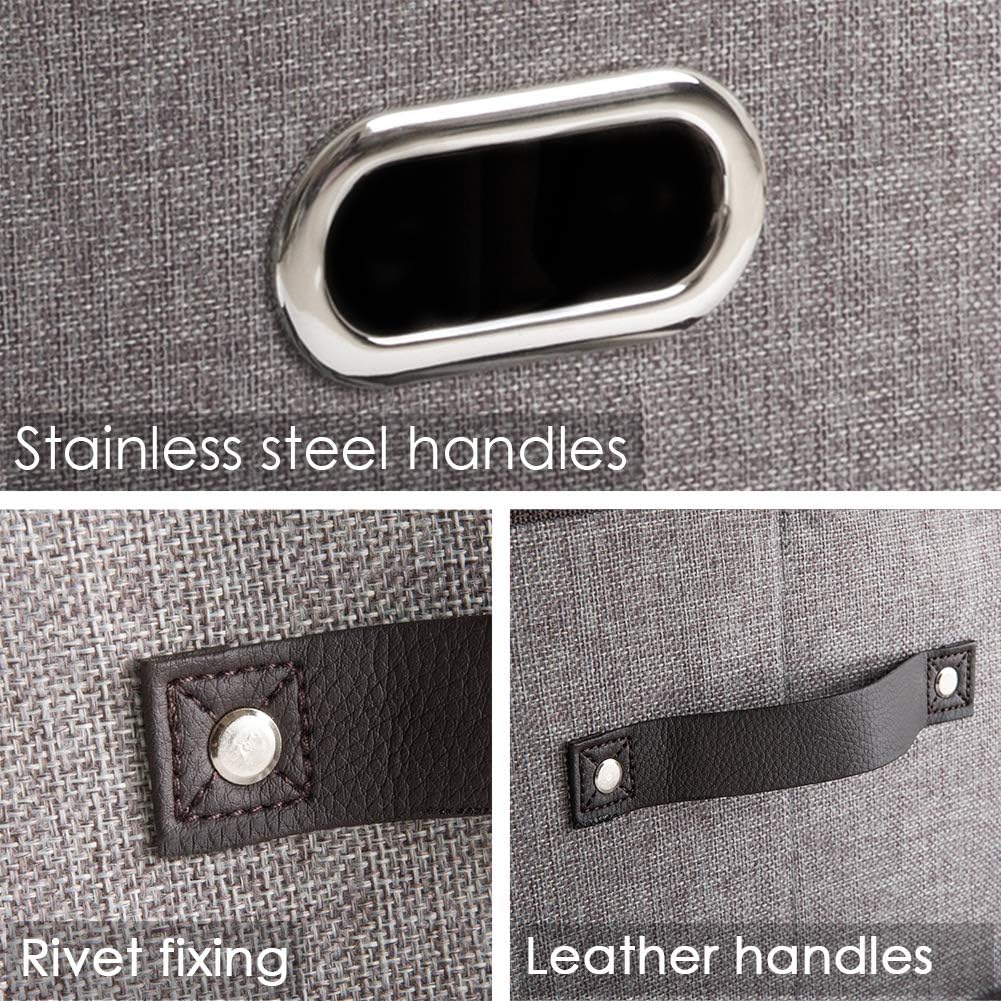PRANDOM Large Foldable Storage Bins for Shelves [3-pack] Decorative Linen Fabric Storage Baskets Cubes with Leather/Metal Handles for Closet Nursery Office Grey and Black Trim (14.9x9.8x8.3 Inch)