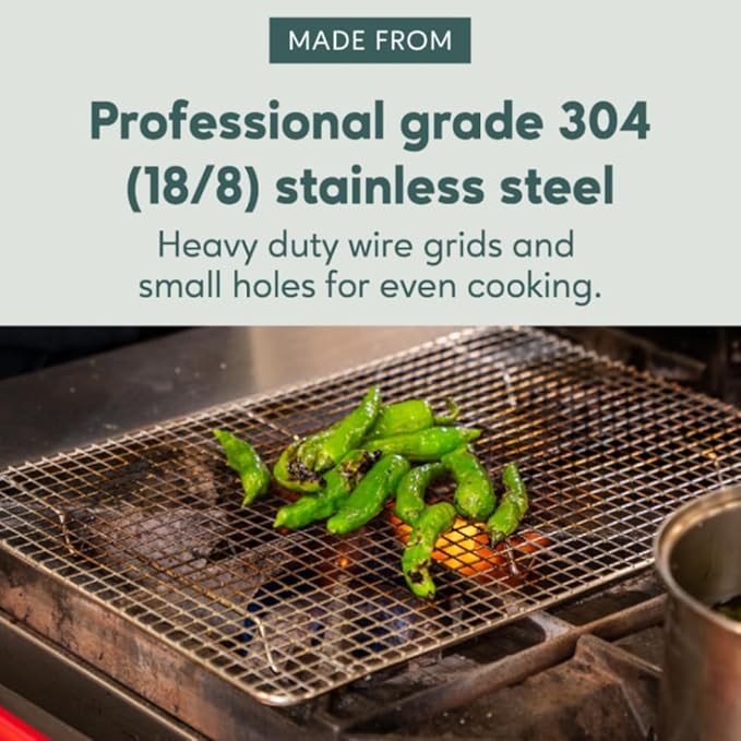 - HEAVY DUTY STAINLESS STEEL STURDY DESIGN: Set of 2 cooling racks for half sheet baking pans are food-safe, professional grade 304 (18/8) stainless steel with strong, heavy duty wire grids, small holes, smooth no-snag edges, and a full 1 inch height resulting in greater all around airflow for even cooking, cooling and roasting every time