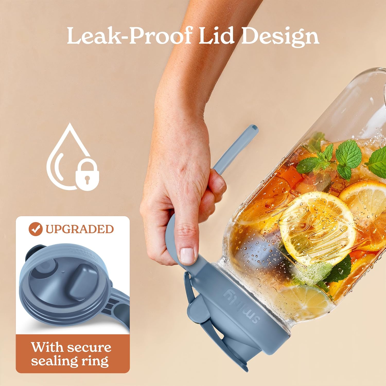 SMIRLY 64 oz Mason Jar Pitcher, Glass Pitcher with Wide Mouth, Water Jug with Double Leak Proof Lid for Iced Coffee, Hot Water, Breast Milk