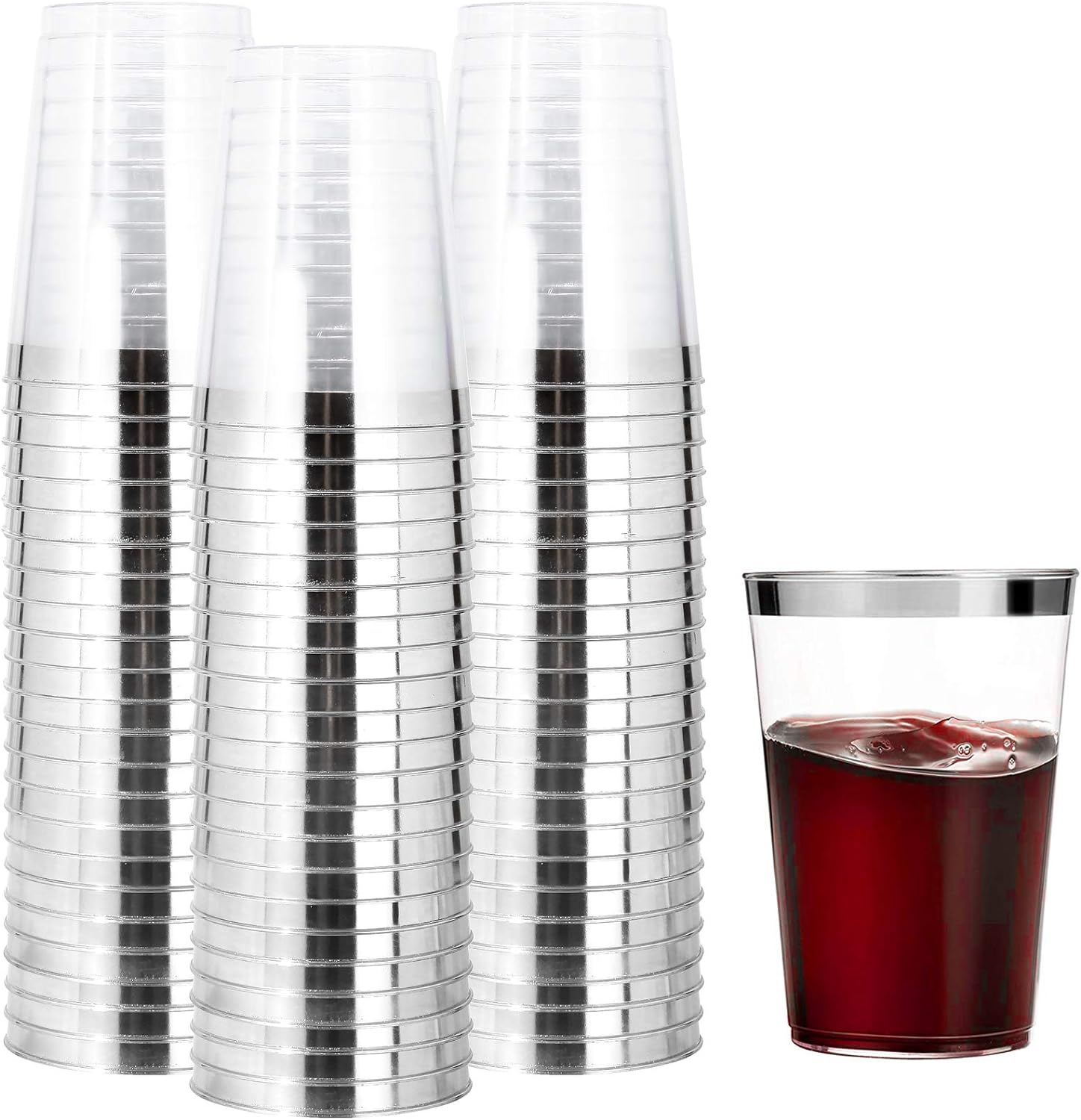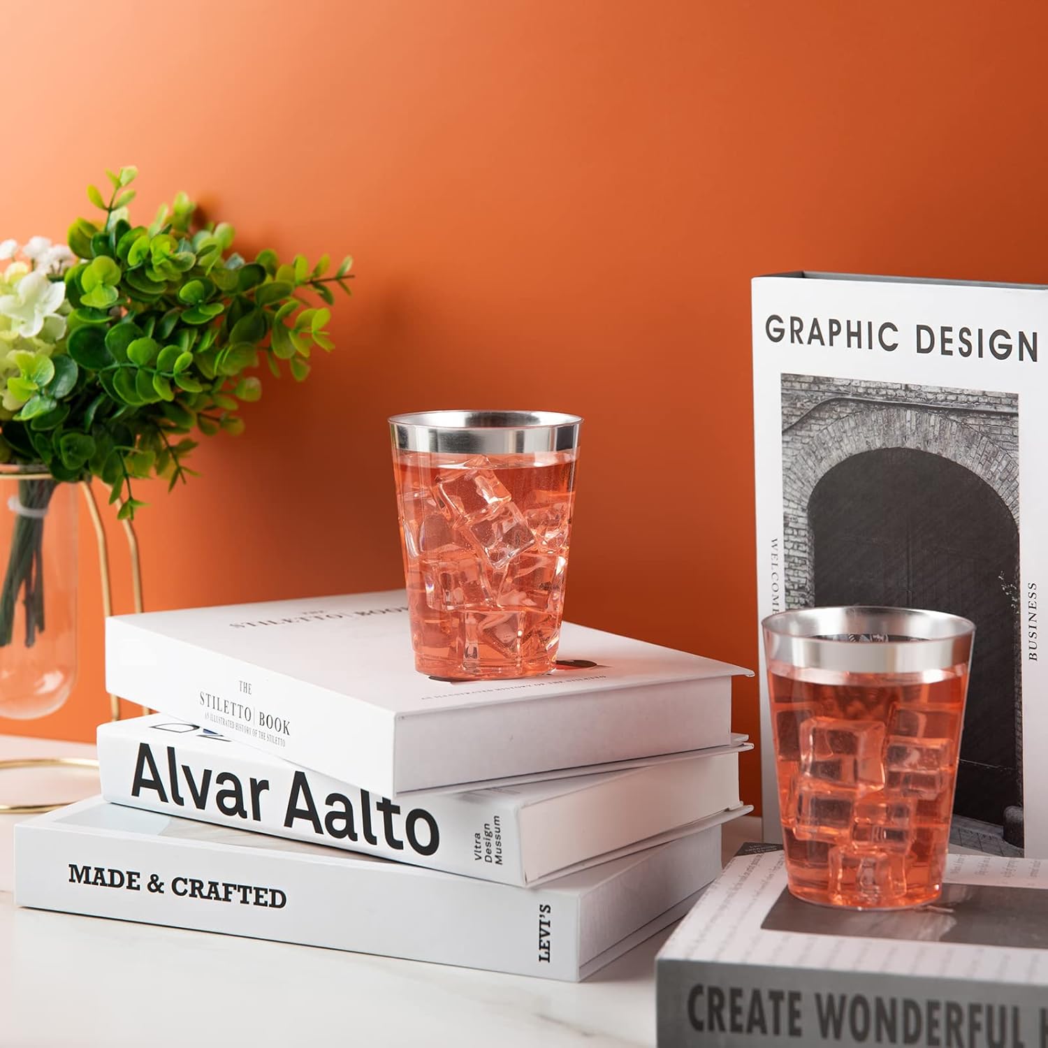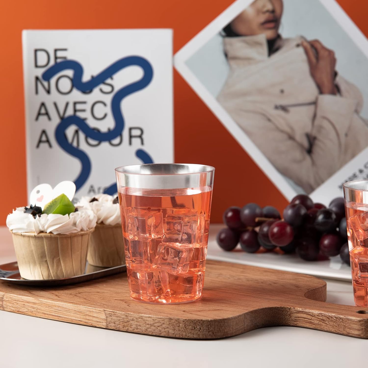 I00000 200pcs Silver Disposable Plastic Cups 10 oz Clear Old Fashioned Tumblers With Silver Rim - Fancy Wedding Party Cups, Elegant Wine Glasses, Cocktail Tumblers