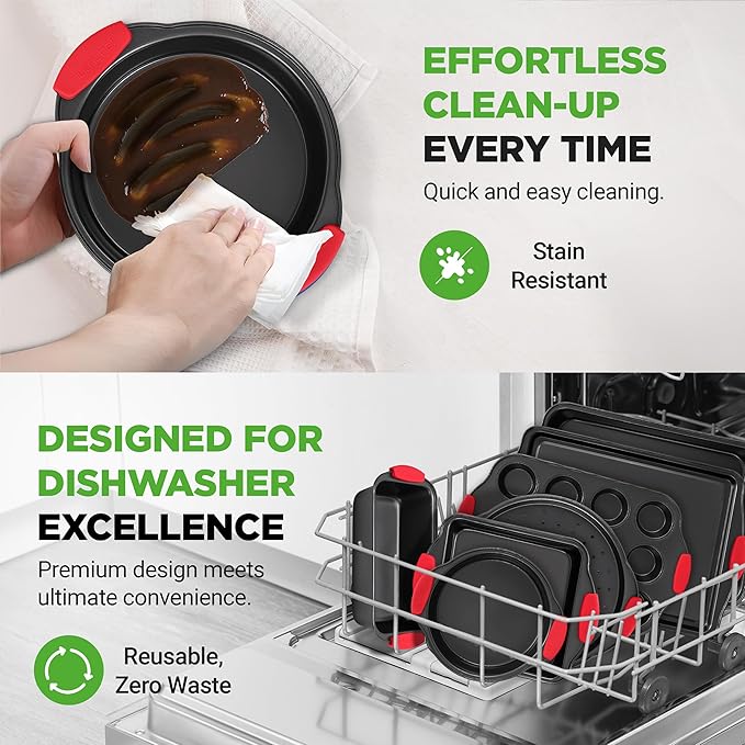 - HEATPROOF SILICONE HANDLES: The commercial grade restaurant quality kitchen bakeware features red silicone handles to prevent accidental burns. Also stain-resistant, easy to clean & dishwasher safe but hand washing is recommended to extend pan life