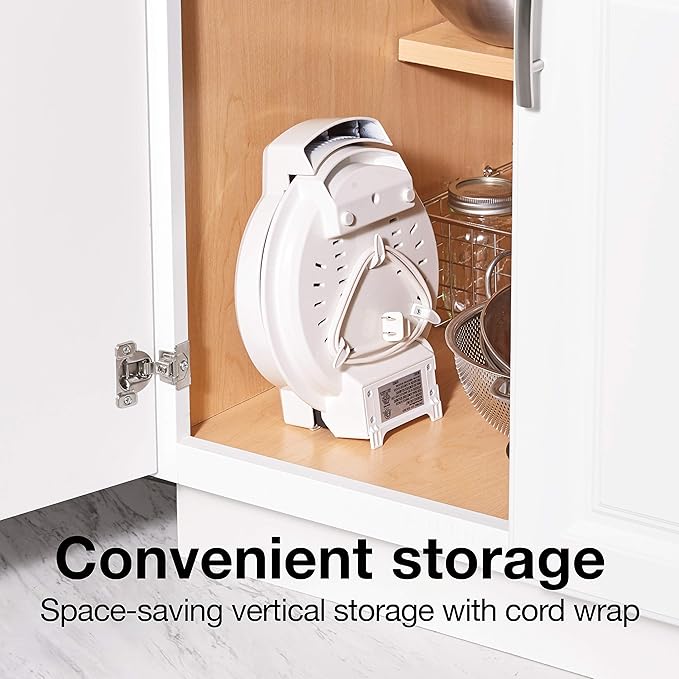 - CORD STORES IN BOTTOM COVER The electrical cord stores neatly in the bottom cover to eliminate kitchen clutter