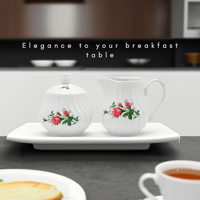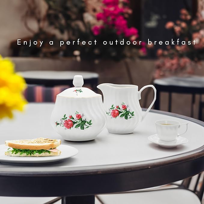 Sugar and Creamer Set - Porcelain Sugar and Creamer Floral Vintage Tea Set with Gold Trims & Embossed Swirls - Exquisite Fine China Tea Set for Parties & Celebrations - Vintage Rose Set by Lynns