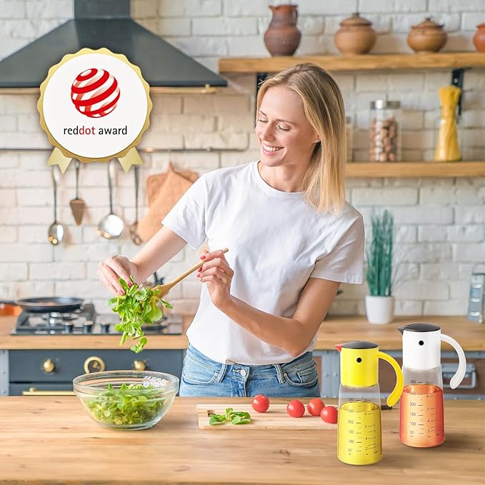Vucchini Olive Oil Dispenser Bottle for Kitchen Cooking 10 oz - Auto Flip Vinegar Dispenser Container- Leakproof Glass Cruet with Non-Drip Spout Dispenser (white and yellow)