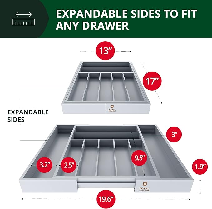 - πΏππππππππππ ππ π ππ ππππ ππππππππ πππππππ πππππππ: Our deep bamboo drawer organizer is ideal for saving kitchen storage space, thanks to its adjustable storage drawers that expand from 17βx13β to 17x19.6β wide with 1.9β deep slots. Easy to use and ideal for helping to maximize kitchen storage space, simply pull apart from the sides for additional storage space and a more secure fit for wider drawers. Different sized compartments allow for standard silverware and large utensil placement