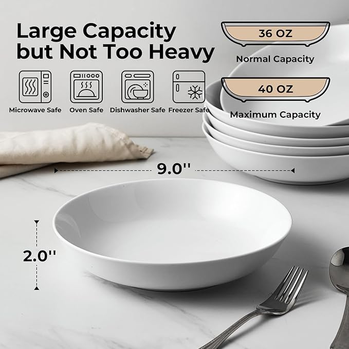 Y YHY 9" Pasta Bowls, 40oz Large Salad Bowls Set of 6, Wide Shallow Ceramic Bowls for Serving Soup, White Dinner Plates Set for Kitchen, Microwave Dishwasher Safe