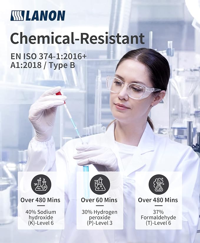 - Chemical-Resistant - The disposable nitrile gloves are powder-free, silicone-free, and non-sterile, tested to EN ISO 374 Chemical-Resistant. It's waterproof and resistant to a variety of low-concentration oil grease, light solvents, brake cleaner, and light and high-purity solvents, such as household detergent stain remover and other cleaners.