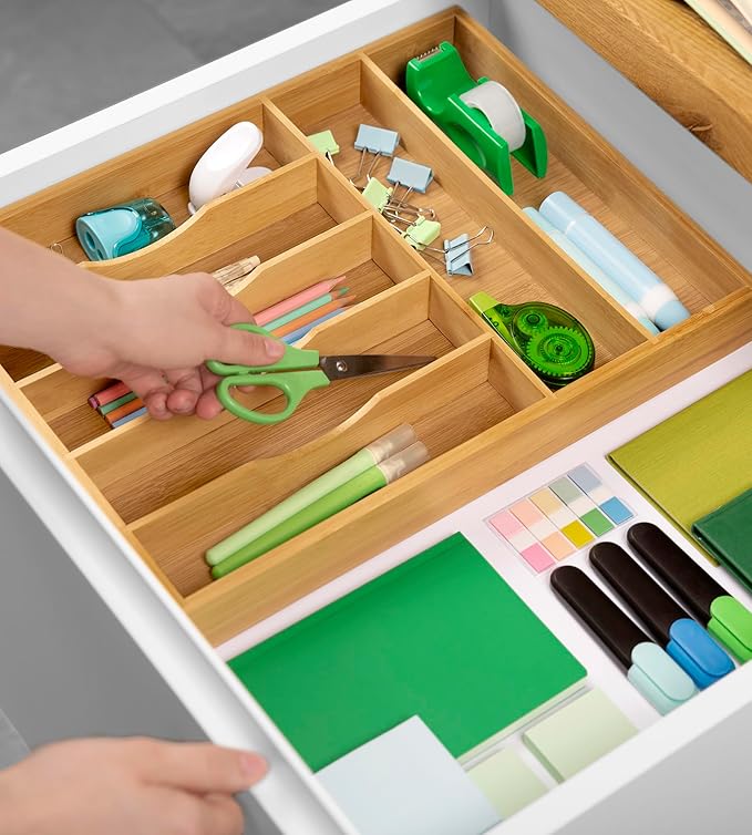 - ππππππ ππππππ πππππππ ππππ: This bamboo drawer organizer is exactly what youβve needed to help get your kitchen in tip-top shape. It may become easy to fall into the habit of tossing small items into the nearest drawer, creating the dreaded junk drawer or kitchen utensil drawer with piles of mixed tools. Measuring 16.3"x12.3", with 7 convenient 1.9" deep slots, conveniently organize and store your kitchen cutlery and rearrange flatware for a tidy, clean look