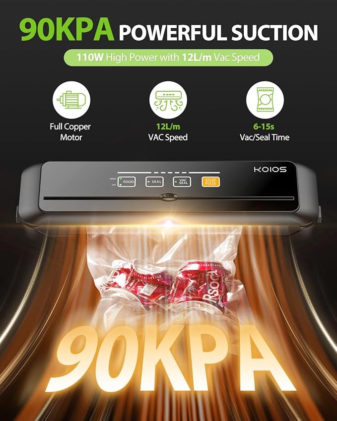 - High Power Sealer and Built-in Cutter - KOIOS VS6621 86Kpa vacuum air sealing system with low vibration for high-security preserves refrigerated, frozen, and pantry items. Fast powerful suction removes air preserving your food in just 6-10s