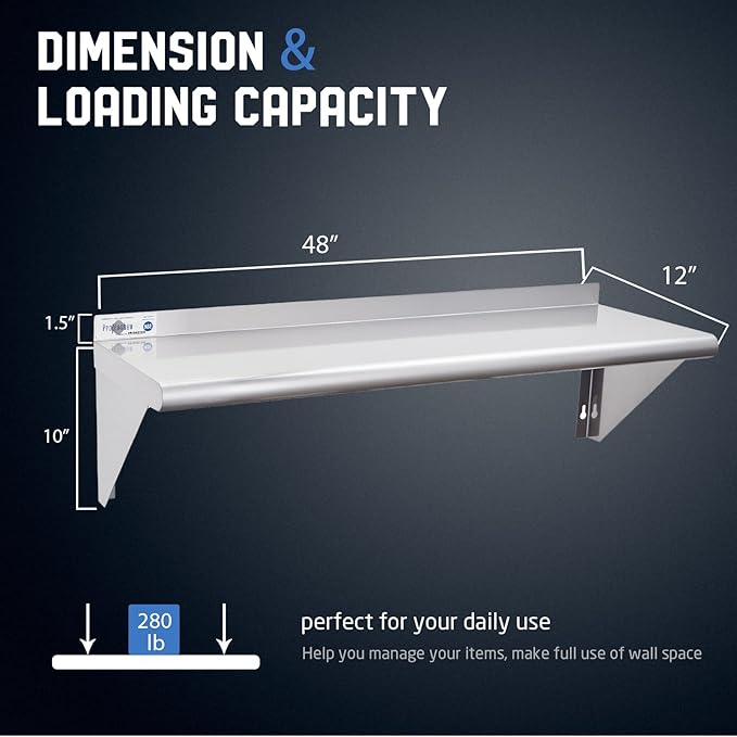 - Strong Bearing Capacity: It has excellent bearing capacity. The 48 inch metal wall mounted shelf can bear 280 lb and can be used to place condiments, kitchen supplies, including microwave ovens, ovens, rice cookers and other heavy objects. The size is 12 "W x 48" L. It adds extra storage space to help you arrange your kitchen space and keep it tidy