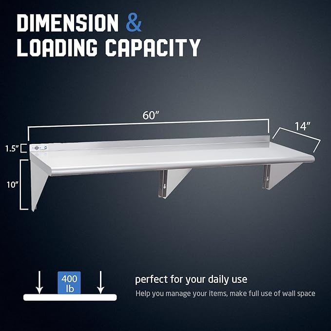 - Strong Bearing Capacity: It has excellent bearing capacity. The 60 inch metal wall mounted shelf can bear 400 lb and can be used to place condiments, kitchen supplies, including microwave ovens, ovens, rice cookers and other heavy objects. The size is 14 "W x 60" L. It adds extra storage space to help you arrange your kitchen space and keep it tidy