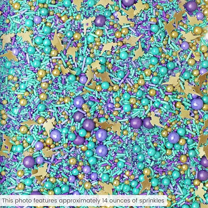 - Vibrant aqua, lavender, purple, and gold sprinkles with genie bottle toppers, perfect for Arabian princess-themed birthday cakes, cupcakes, and cookies