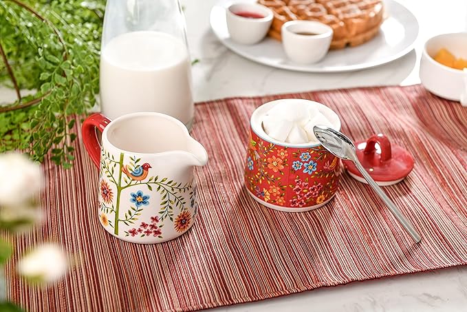 Bico Red Spring Bird Ceramic Sugar and Creamer Set, Sugar Bowl with Lid, Cute Container for Coffee Bar, Kitchen Countertop Accessories, Microwave and Dishwasher Safe