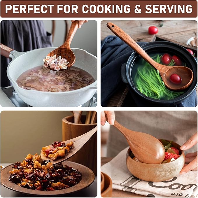 - [Wooden Cooking Tools for Non-stick Cookware]: Embrace the durability of our teak cooking set,and offer superior heat insulation without compromising quality, protecting your hands and expensive non-stick cookware from damage