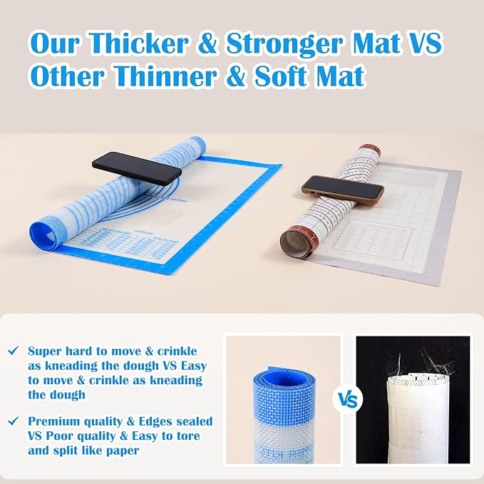 - A Level Up Pastry Mat:The thickness of the mat is 0.7MM.The thickness of the silicone pad is almost twice as thick as the others(0.4MM).The 0.7MM mat will stay good on the table and not wrinkle when used.And it is also much durable.