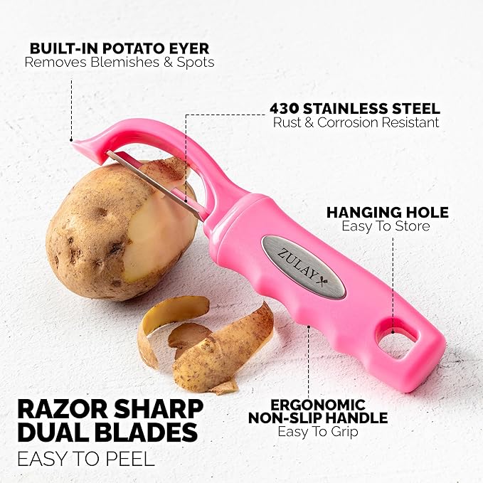 Zulay Kitchen Premium Vegetable Peeler for Kitchen - Swivel Peeler with Razor Sharp Stainless Steel Blades & Strong Ergonomic Handle - Dishwasher Safe, Easy To Use with Blemish Remover - Pink