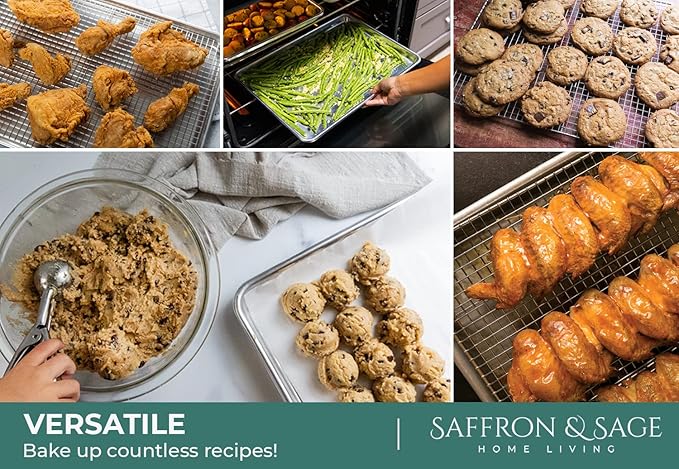 - This versatile pan and wire rack set will allow you to bake countless recipes. They can be used as a meat resting rack or in the oven for many cooking techniques such as roasting, broiling, grilling, and dehydrating. You can make grilled meat, spatchcock turkey, crispy bacon, chicken wings, bbq ribs, baked potatoes just to name a few. Looking for something sweet? Bake novelty desserts like lemon bars, magic cookie bars, cookies, sheet cake, or jelly roll. The possibilities are endless!