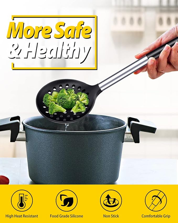 - Thoughtful Design : The good-quality 18/8 stainless steel keeps you away from the trouble of kitchen utensils rusting or breaking; This anti-scald silicone handle is not easy to conduct heat and is more comfortable to hold than traditional utensils